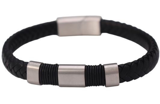 В центре браслета расположены три металлические вставки из нержавеющей стали, которые служат ярким акцентом в дизайне. Две крайние вставки имеют форму цилиндра и обмотаны черным шнуром, что создает дополнительный текстурный контраст с гладкой кожей и металлом.